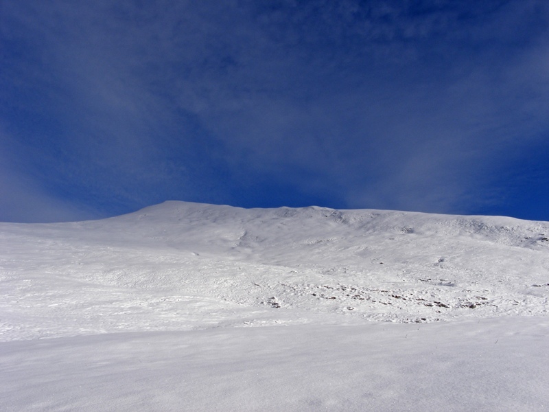 Il lungo crestone che porta in vetta presenta già consistenti cornici e le pietre che ogni tanto sentiamo sotto i nostri piedi, ci convincono ad affrontare il tratto in questione con la necessaria prudenza.