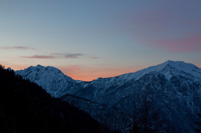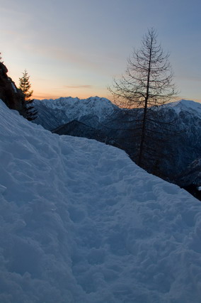 Così partiamo da Almè con il buio e, arrivati alla curva degli Sciòcc, partiamo decisi sul sentiero normale. Ad est inizia lo spettacolo dell’alba e non posso fare a meno di scattare qualche foto! Usciti dal bosco i primi raggi di un Sole un po’ smorto illuminano la Valsalmurano e notiamo che per fortuna (o purtroppo) il percorso di salita è tracciato. Così la camminata risulta più agevole perché il freddo ha gelato la traccia e si cammina bene.